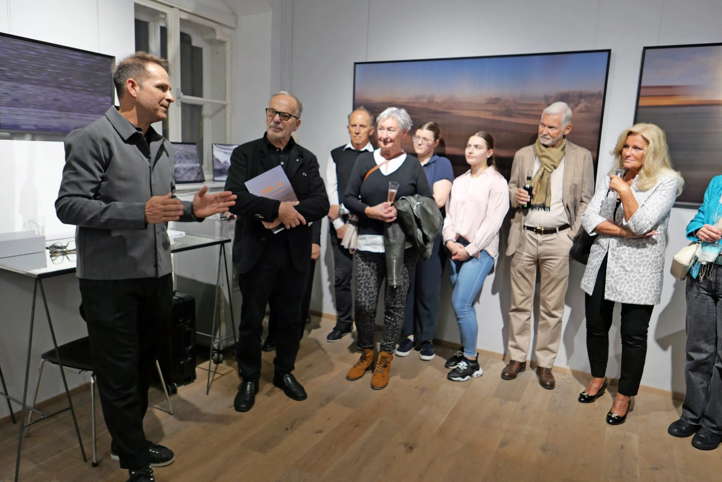 Neben diesen Lentikulardrucken werden auch großformatige Werke auf metallisierten Oberflächen präsentiert. Dieses Spiel mit Materialität und Licht spiegelt nicht nur die Vielschichtigkeit der künstlerischen Handschrift wider, sondern verweist zugleich auf den beruflichen Werdegang als Spezialist für Fine Art Print.